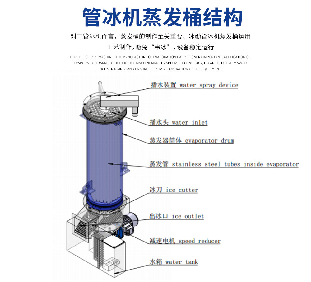 2、管冰機(jī)所有與制冰水接觸部分材質(zhì)均是食用級(jí)材料。 由多根不銹鋼管組成蒸發(fā)器制冷劑在管與管之間流動(dòng),水在管內(nèi)從上往下在分水器的作用下呈螺旋狀流動(dòng), 水在流動(dòng)過(guò)程中形成冰。