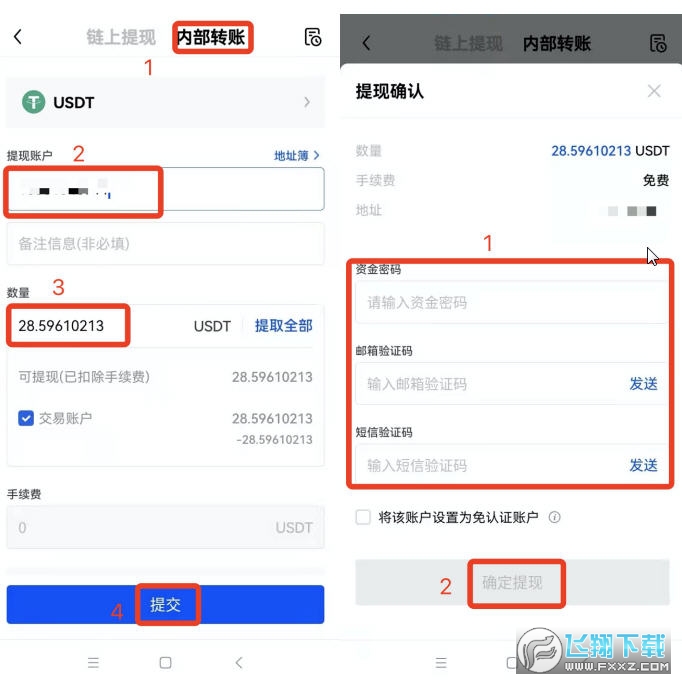 2.內(nèi)部轉(zhuǎn)賬:打開歐易APP,選擇【資產(chǎn)】欄 ―【提現(xiàn)】―選擇幣種【USDT】―選擇【內(nèi)部轉(zhuǎn)賬】―輸入【提現(xiàn)賬戶】―【數(shù)量】―【提交】―按要求獲取并輸入相關(guān)密碼/驗(yàn)證碼―【確定提現(xiàn)】,完成操作。